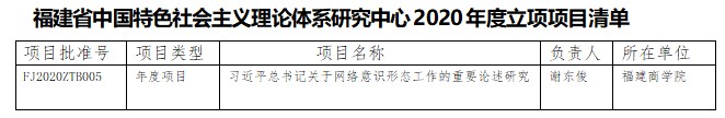 近日,中共福建省委宣传部公布了福建省中国特色社会主义理论体系研究中心2020年立项项目清单。beat365正版唯一官网必一谢东俊老师主持申报的《习近平总书记关于网络意识形态工作的重要论述研究》(项目编号:FJ2020ZTB005)被遴选为福建省中国特色社会主义理论体系研究中心年度项目。