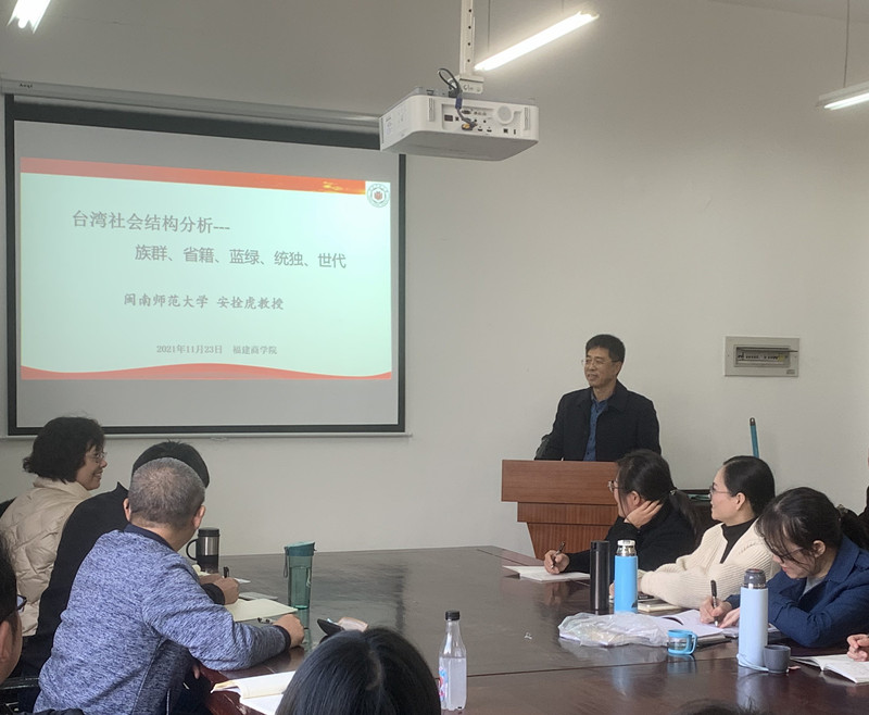 11月23日,闽南师范大学闽南文化研究院台湾研究所所长、台湾问题与两岸关系研究专家安拴虎教授应邀莅临beat365官网作题为《台湾社会结构分析》学术报告,beat365正版唯一官网必一全体教师参加报告会。
