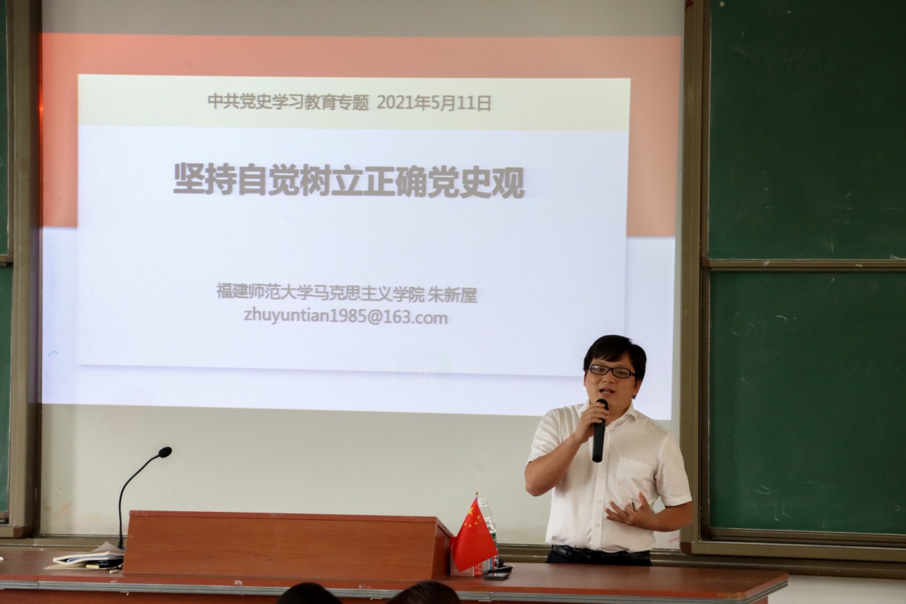5月11日下午,马克思主义理论大讲堂邀请党史学习教育省委宣讲团成员朱新屋老师到beat365官网作题为“坚持自觉树立正确党史观”的专题讲座。beat365正版唯一官网必一全体教师、大讲堂成员,统战部、规划处、国资处支部党员到场听取报告。