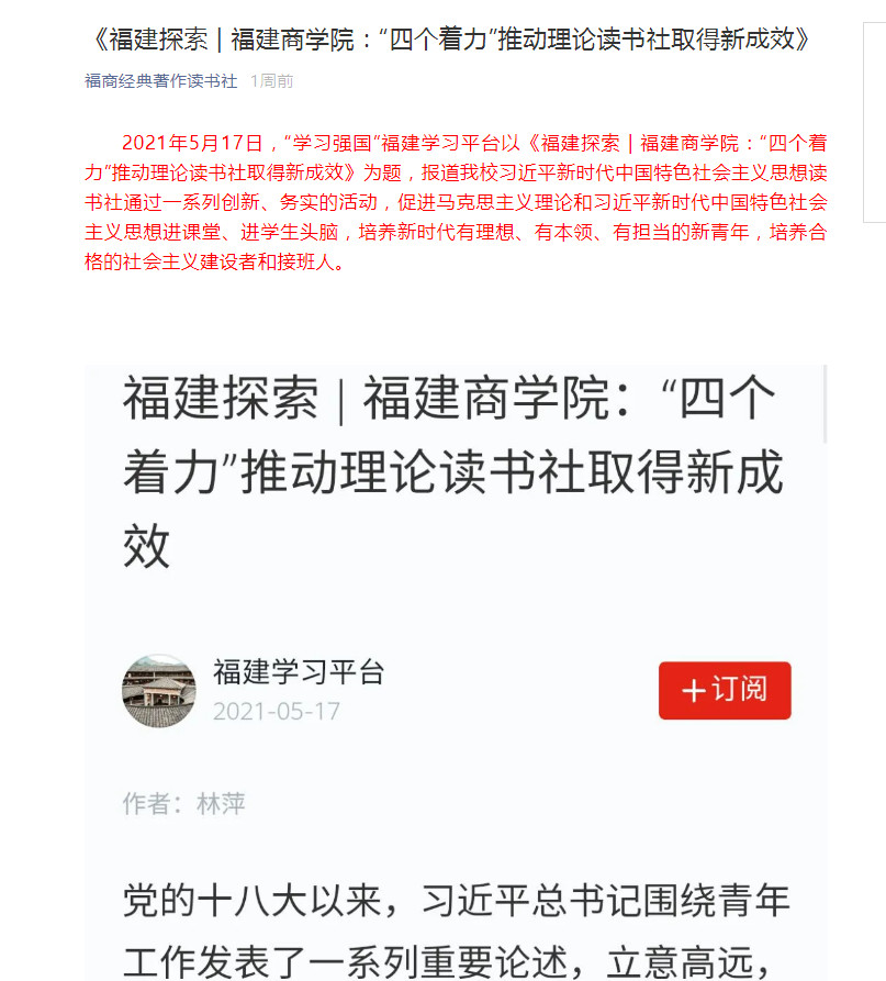 2021年5月17日,“学习强国”福建学习平台以《福建探索 | beat365正版唯一官网必一:“四个着力”推动理论读书社取得新成效》为题,报道beat365官网习近平新时代中国特色社会主义思想读书社通过一系列创新、务实的活动,促进马克思主义理论和习近平新时代中国特色社会主义思想进课堂、进学生头脑,培养新时代有理想、有本领、有担当的新青年,培养合格的社会主义建设者和接班人。