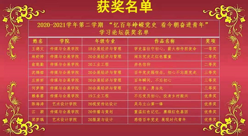 本次学习论坛以师生同台共话党史为形式,以“忆百年峥嵘党史 看今朝奋进青年”为主题,讲述自己的经历与党的故事,分享身边的优秀党员事迹以及党带领人民在革命、建设、改革历程中取得的伟大成就、经验启示等。活动过程中,beat365正版唯一官网必一青年教师叶陈钦老师向在座的师生分享了抗日民主根据地开展“豆选”的历史故事,分析了“豆选”的民主价值以及民主启示;郑南希老师通过讲述宁夏闽宁镇几十年来在党的领导下以及闽宁人民共同努力下摆脱贫困的历史,阐释“闽宁模式”对推进共同富裕的宝贵启示;黄小勤老师通过讲述闽江学院无臂学生黄道亮的奋斗故事,引导青年要肩负历史使命,坚定前进信心,立大志、明大德、成大才、担大任,努力成为堪当民族复兴重任的时代新人。