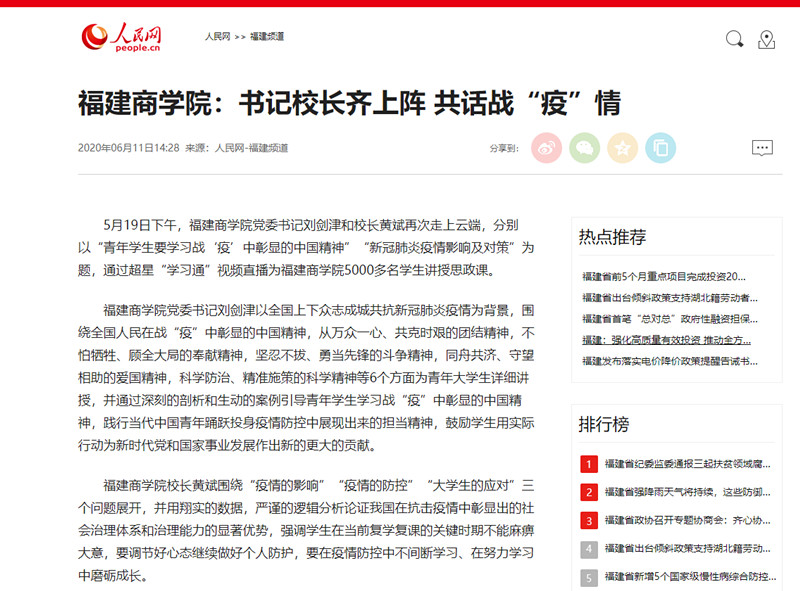 2020年6月11日,人民网以《beat365正版唯一官网必一:书记校长齐上阵 共话战“疫”情》为题,报道beat365官网书记校长分别以“青年学生要学习战‘疫’中彰显的中国精神”“新冠肺炎疫情影响及对策”为题,通过超星“学习通”视频直播为beat365官网5000多名学生讲授思政课的特色做法。