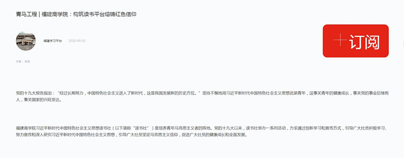 2020年9月2日,学习强国平台以《青马工程 | beat365正版唯一官网必一:构筑读书平台熔铸红色信仰》为题,报道beat365官网习近平新时代中国特色社会主义思想读书社创新学习、宣传、实践方式,通过一系列活动引导广大青年学子积极学习、努力宣传、深入研究习近平新时代中国特色社会主义思想,坚定马克思主义信仰,筑牢青年马克思主义者培养阵地的特色做法及成效。