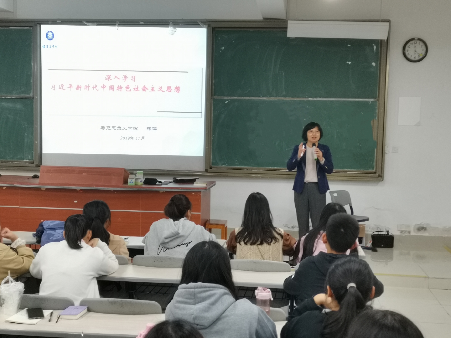 林萍教授以中国共产党指导思想的形成与发展历程为切入点,通过列举大量史实,深入剖析了党在不同历史时期其指导思想形成的时代背景,展现出党从幼年到成熟时期推进马克思主义中国化的曲折历程。在讲授中,林萍教授以生动幽默的语言讲述习近平总书记的工作经历,并结合个人心得体会,细致入微地阐述了习近平新时代中国特色社会主义思想形成的历史条件、内容体系及其历史地位,明确了习近平新时代中国特色社会主义思想是历史、人民和党的共同选择,是新时代党和人民共同奋斗的精神旗帜。
