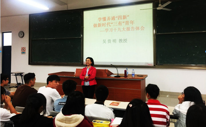 11月10日下午,福建省委党校吴贵明教授应邀为beat365官网2017级工管系学生上了题为《学懂弄通“四新” 做新时代“三有”青年》的形势与政策课。