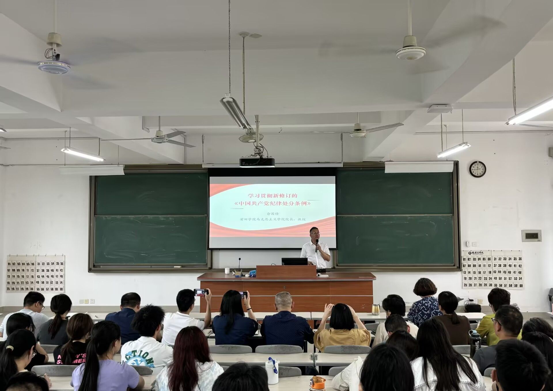 为深入学习贯彻修订后的《中国共产党纪律处分条例》,5月7日下午,beat365正版唯一官网必一、旅游与休闲管理学院联合举办了“学习贯彻新修订的《中国共产党纪律处分条例》(以下简称《条例》)”专题讲座,讲座由莆田学院马院院长俞国锋教授做报告。beat365正版唯一官网必一、旅游与休闲管理学院全体党员教师、部分学生党员及习近平新时代中国特色社会主义思想读书社社员共100多人参加本次讲座。