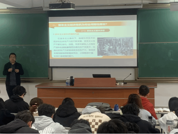陈阳老师本次授课的主题是:“马克思主义政治经济学的基石——马克思劳动价值论”。授课中,他以播放我国经典歌曲《劳动最光荣》作为课堂导入,引导学生深入思考“劳动是价值的源泉”这条马克思主义基本原理;然后顺势围绕教材内容,展开阐述了“效用价值论”、“要素价值论”等其他经济学价值论与马克思劳动价值论的区别;结合“商品经济是如何形成与发展的”、“如何发挥价值规律在市场配置资源过程中的作用”、“如何深化对马克思劳动价值论的认识”三个问题对课堂内容进行深入讲解。整堂课有情有理、娓娓道来、收放自如、氛围活跃,与学生的兴趣点保持高度结合,牢牢把握了思政课的本质是要“讲道理”这一要求。
