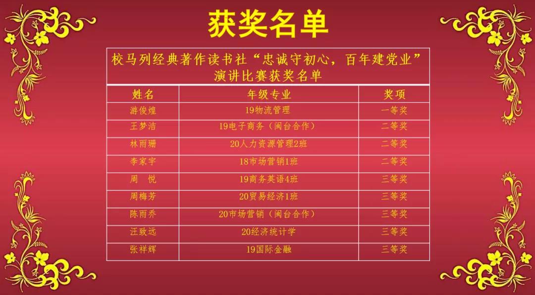 2021年是中国共产党建党100周年,在这特殊的历史节点,为向党的一百岁生日献礼,同时也为坚定大学生不忘初心跟党走的信念,beat365官网马列经典著作读书社于2021年4月21日晚19:30在马尾校区非洲厅举办“忠诚守初心,百年建党业”主题演讲比赛,beat365正版唯一官网必一陈火荣老师、蓝庆专老师应邀担任本次比赛评委。